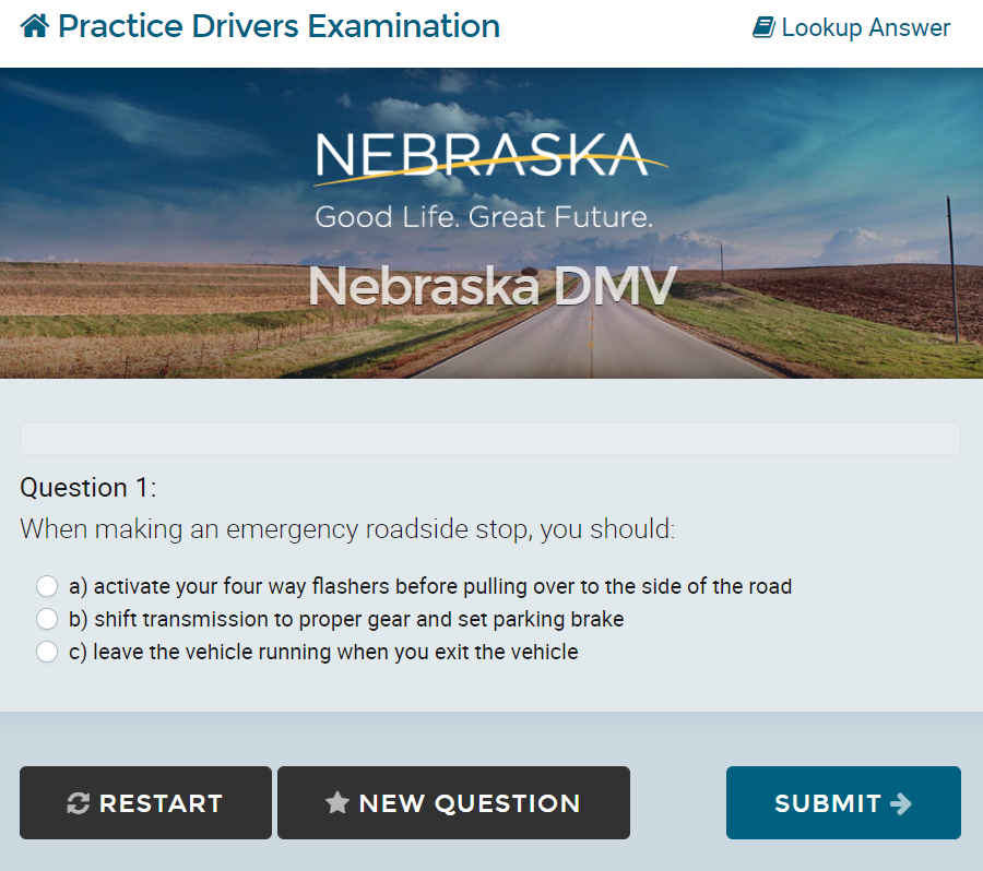 Reading the Nebraska Driver’s Manual is the best way of beginning preparation for a learner’s permit test. After reading through this booklet, you will be prepared to start taking learner’s permit practice tests. Audio Version